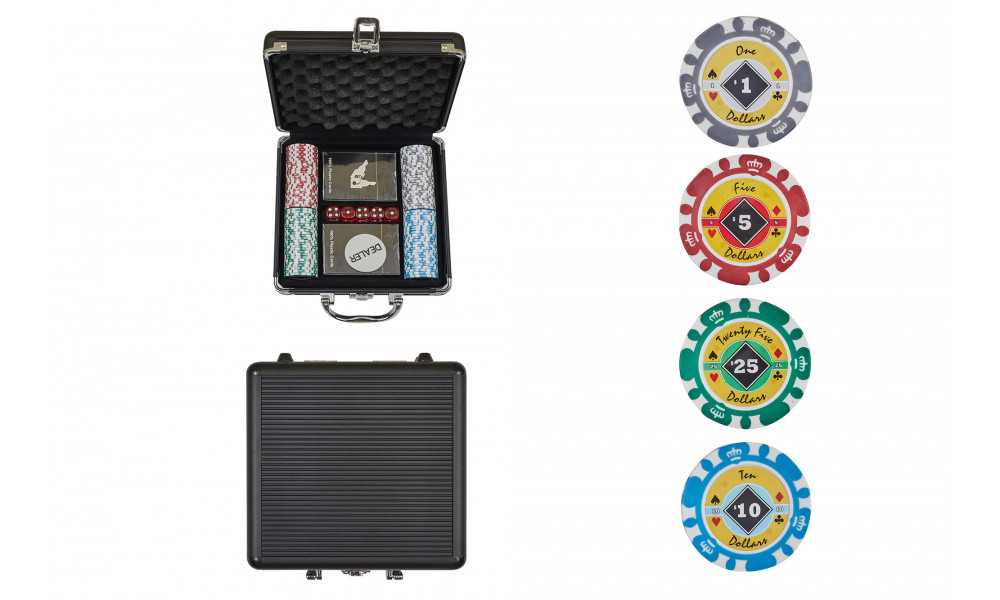 Набор для покера Crown на 100 фишек, включающий в себя все необходимое для классической карточной игры, позволяет устроить казино даже у себя дома. Здесь все соответствует заданным мировым покерным стандартам: фишки весят по 14 грамм, карты и кубики выполнены в классических размерах. Все это упаковано в стильный и удобный кейс из прочного металла, благодаря чему набор легко брать с собой даже в поездки, а при хранении ничего не растеряется.